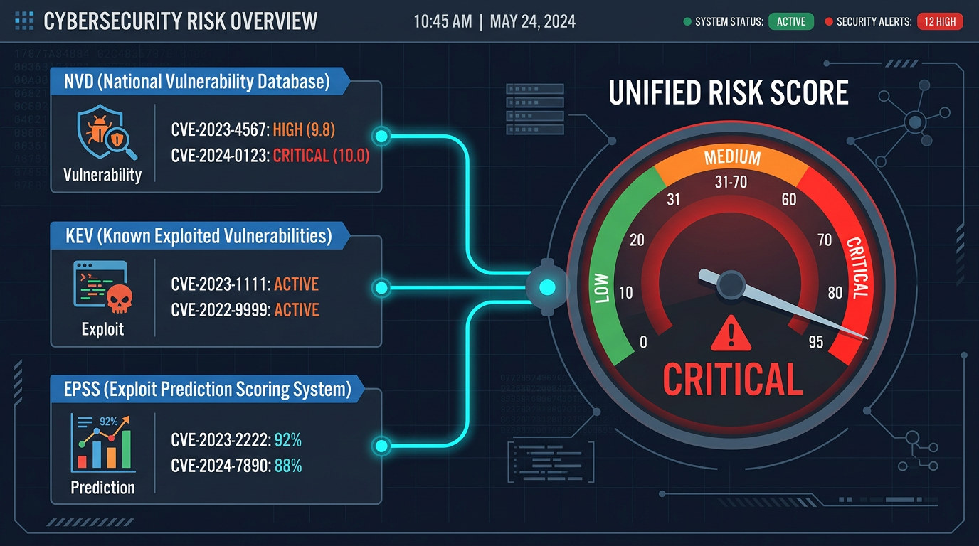 The composite score combines all three sources into a single 0–10 number with a risk tier (CRITICAL, HIGH, MEDIUM, LOW):